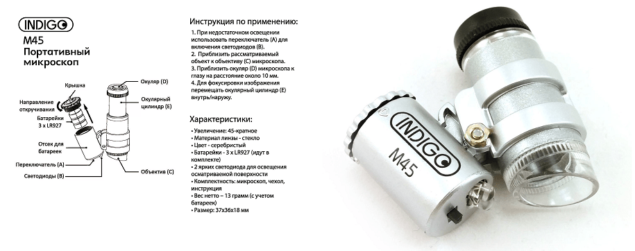 Карманный микроскоп IINDIGO/Индиго M45, 45-кратное увеличение, светодиодная подсветка
