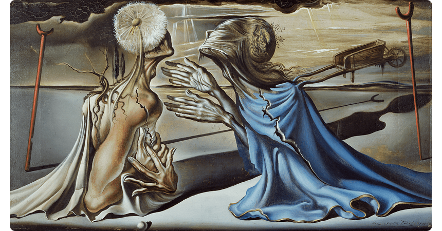 Сальвадор Дали соединил в картине любовь и смерть. Голова легендарного героя Тристана напоминает отцветающий одуванчик, а из плеч Изольды вырастает повозка. Переплетающиеся корни символизируют деревья, которые выросли на могилах влюблённых.
