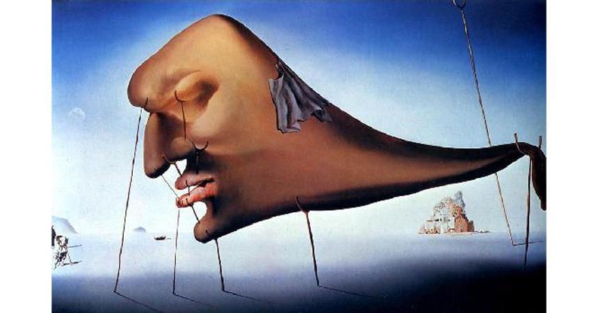 На полотне Дали отразил двойственность сна, его тяжесть и одновременно хрупкость. Тонкие опоры в любой момент могут сломаться и вернуть спящего из путешествия в бессознательное. Но пока этого не произошло, голова, символизирующая разум, переносит в сон образы городов, лодок и собак.