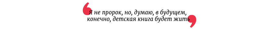 Я не пророк, но, думаю, в будущем, конечно, детская книга будет жить. Возможно, с приходом новых технологий изменится её форма. Ещё, мне кажется, бумажная книга сохранится в виде высокохудожественных подарочных изданий, как с иллюстрациями художников, так и по тематике искусства.