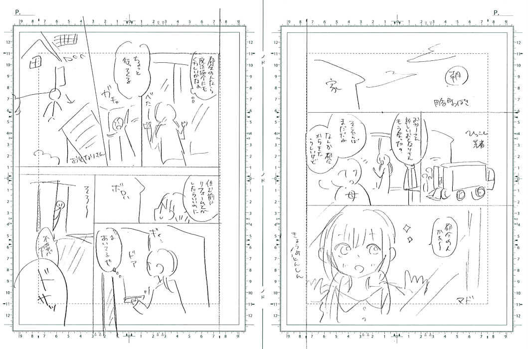 После раскадровки получаются грубые наброски с движениями, схематичным фоном и местом для текста. Художник со сценаристом обсуждают результат, корректируют или кардинально меняют.