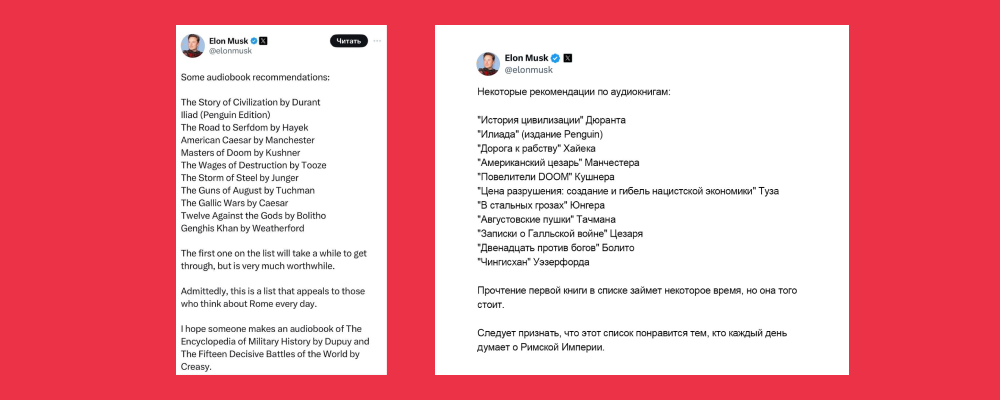 Эти рекомендации – не единственный список Илона Маска. Магнат вообще считает, что успех во многом связан с любовью к чтению. В январе 2025 года бизнесмен рассказал о ещё девяти книгах, которые стоит прочитать каждому. Историческая подборка разбавилась книгами об искусственном интеллекте, технологиях и честности. Делимся и этими книжными советами знаменитости!