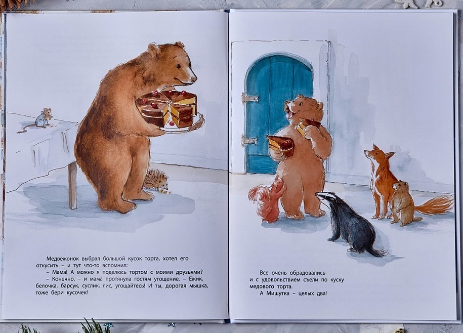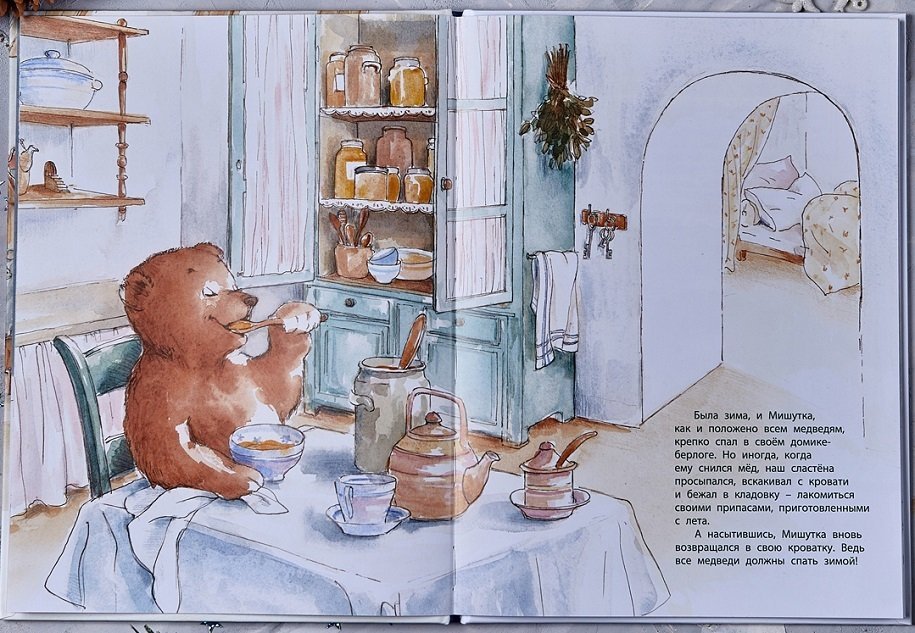 Сказку написала бельгийская писательница Сильви Озари-Лютон, а Ани Веле – проиллюстрировала. Кисть у этой художницы нежная, акварельная, и книга получилась очень приятной. В ней можно увидеть и весьма комфортную, обустроенную берлогу медвежонка, и мышкину кухню с настоящей печкой, стульчиком, крошечной посудой. Кроме занимательного сказочного сюжета, книжка содержит самые первые, ненавязчивые познавательные сведения для малыша о том, почему зимой звери укладываются в спячку.