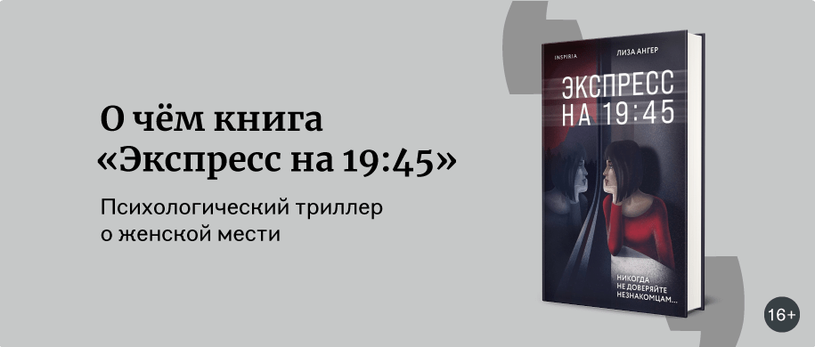 В романе Лизы Ангер «Экспресс на 19:45» трудно найти чёткую грань между жертвой и преступником, персонажи с лёгкостью переходят из одной категории в другую. Кто скрывается под масками бизнес-леди, жены и матери, ласковой няни, случайной попутчицы? Эти загадки будут тревожить читателя до последней страницы. Лиза Энгер уверена — в каждой женщине должна быть тайна, а лучше — две.