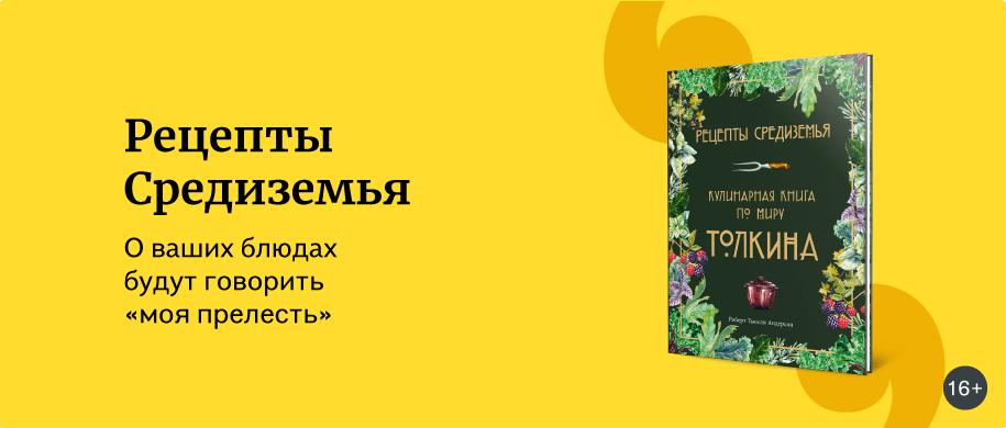 Дж. Р. Р. Толкин, описывая еду хоббитов, вдохновлялся рецептами из своего детства, которое пришлось на позднюю Викторианскую и Эдвардианскую эпохи. Например, знаменитое чаепитие у Бильбо – это типичные блюда Англии того времени, непритязательные и сытные. Но чем питались другие народы в «Хоббите», «Властелине колец», «Сильмариллионе»? Английский писатель Роберт Тьюсли Андерсон исследовал традиции Средиземья с кулинарной точки зрения и собрал под одной обложкой почти 80 рецептов, включая чудодейственные напитки эльфов, простоватые заготовки гномов и даже сырую рыбу Голлума.