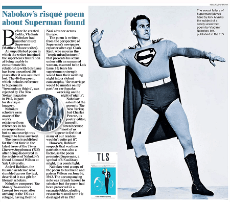 - Весной этого года вы опубликовали в «Таймс» обнаруженное вами стихотворение Набокова, написанное от лица влюблённого Супермена — «Горькая жалоба Человека Будущего». Чем Супермен мог вдохновить Набокова? Ведь он всегда иронично относился к популярной культуре и держался от неё в стороне.
