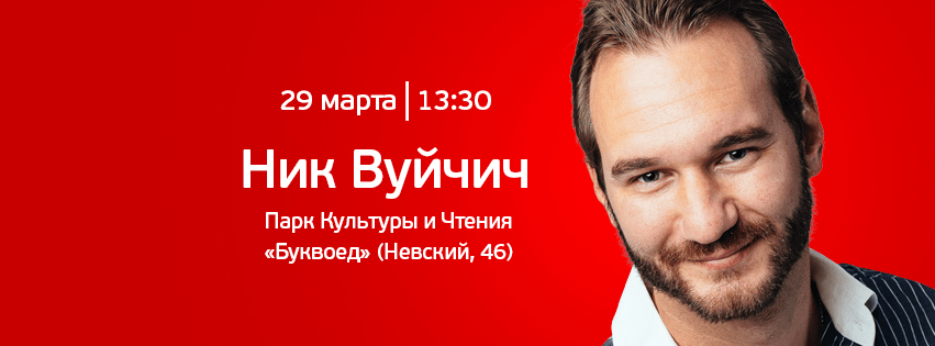 29 марта 2015 года в Парке Культуры и Чтения (Невский, 46) состоится творческая встреча с Ником Вуйчичем. Начало встречи: 13:30.