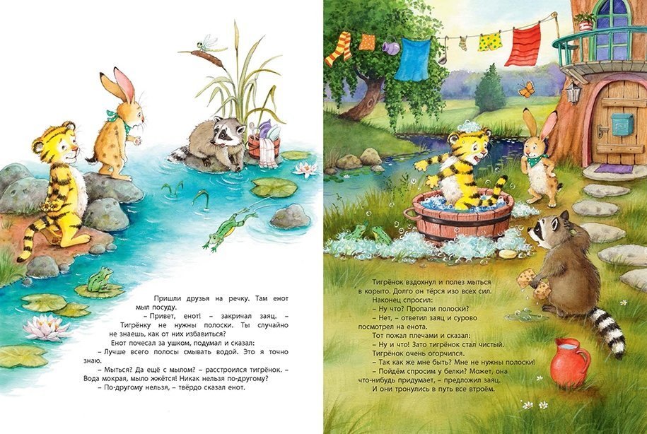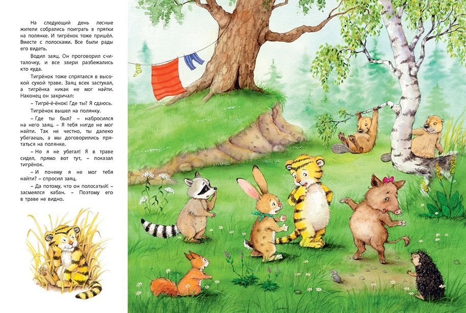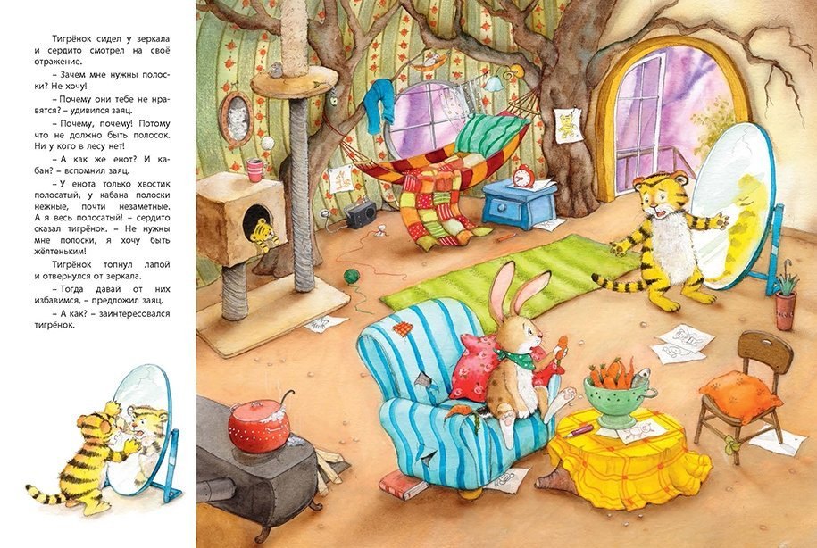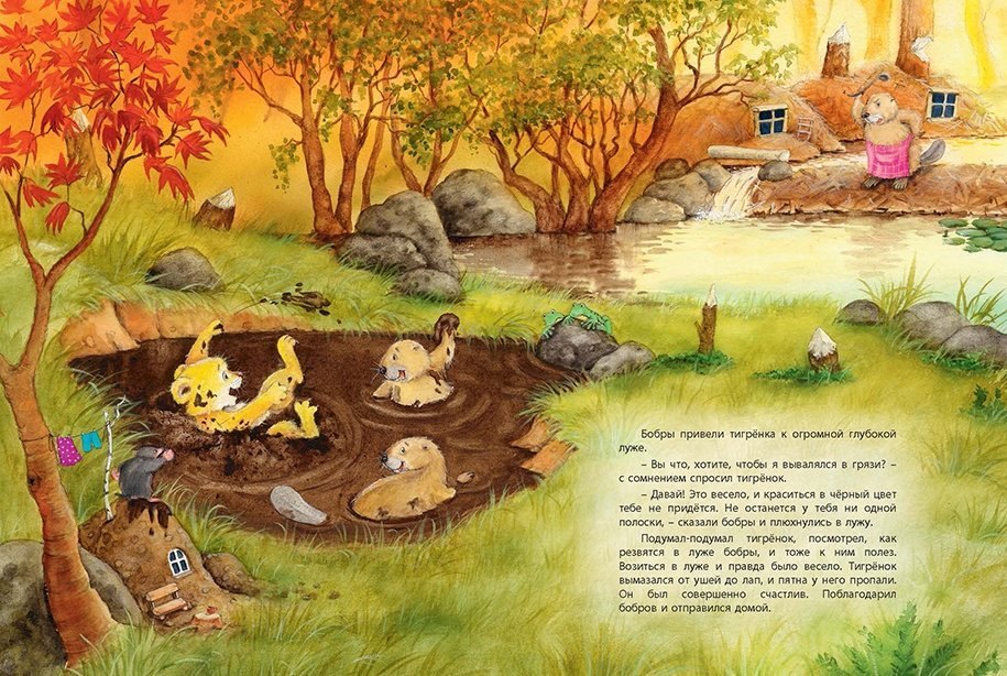 Жил-был на свете маленький тигренок, который был ужасно недоволен своей полосатостью. Что только он не делал, чтобы избавиться от надоевших полосок: купался в тазике с мылом, закрашивал их красками и даже валялся в грязной луже, после чего, правда, ужасно напугал ежика – тот принял его за неизвестного опасного зверя. Ежик от удивления даже ахнул – избавиться от полосок? Ведь если у тебя есть полоски, они для чего-то нужны! Тигренок подумал и решил снова стать таким, каким появился на свет, ведь, как оказалось, полосатому зверю гораздо легче прятаться!